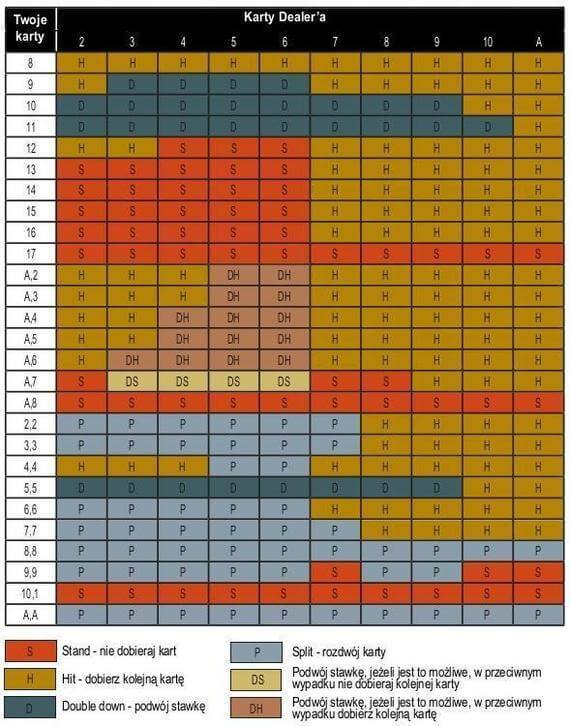 Tabela strategii podstawowej w środkowej części wypełniona jest tymi komendami. Twój ruch to ten, którego symbol przecinany jest przez wartość karty krupiera (pion) i twój początkowy układ (poziom).
