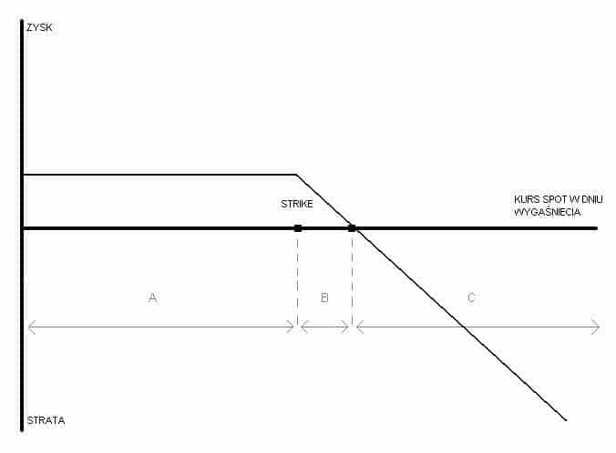 • Pole A – opcja jest realizowana, a strata wystawcy jest większa, tym niższy kurs spot w dniu wygaśnięcia opcji.