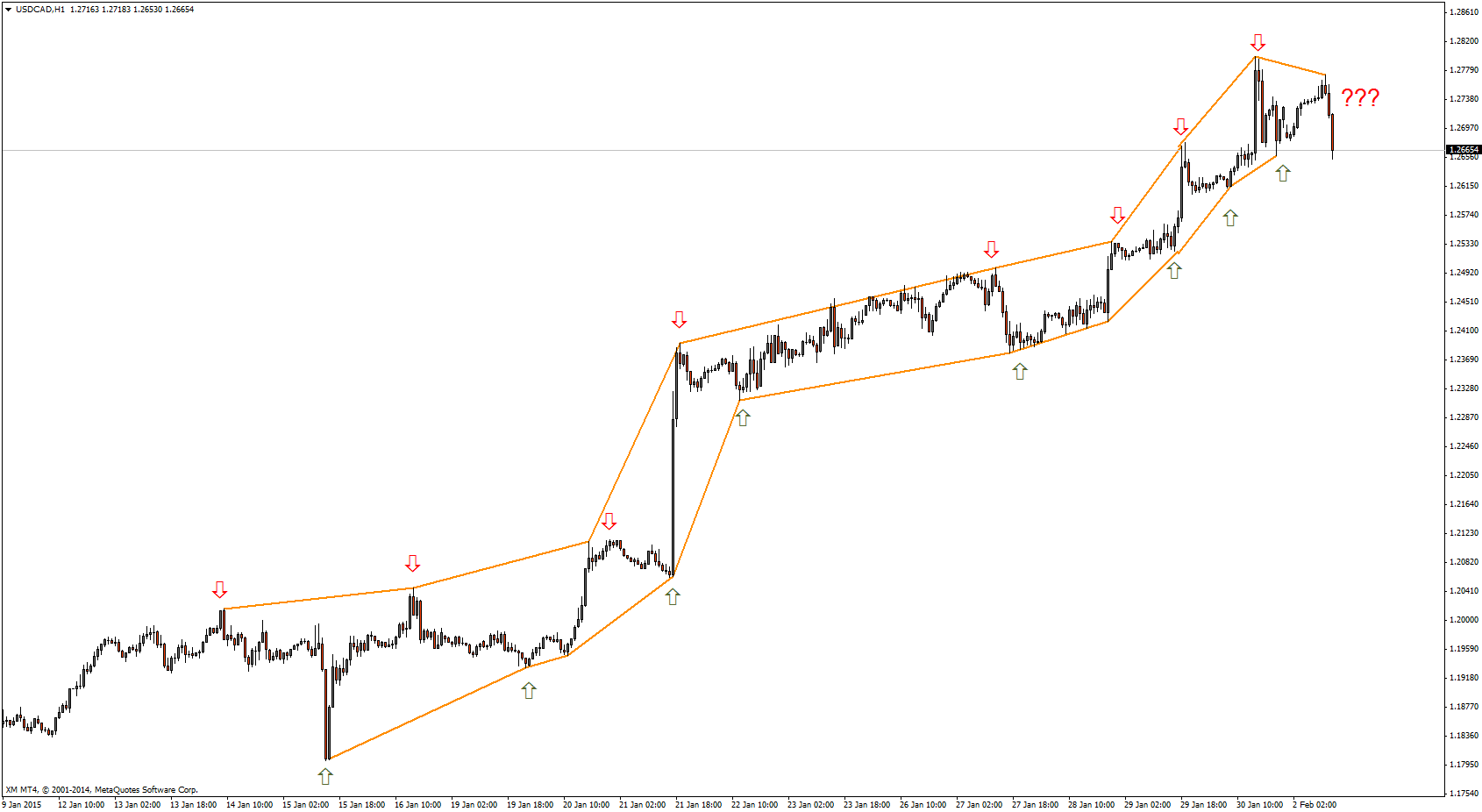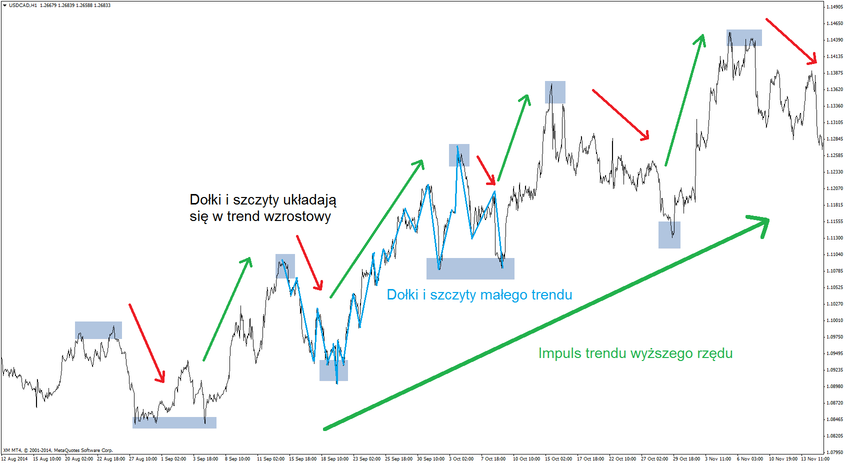 W Price Action szczyty i dołki mają fundamentalne znaczenie, więc podstawowym kryterium trendu jest rozmieszczenie szczytów i dołków – w trendzie wzrostowym kolejne dołków i szczyty będą wyższe, a w trendzie spadkowym kolejne dołków i szczyty będą niższe i coraz niższe.