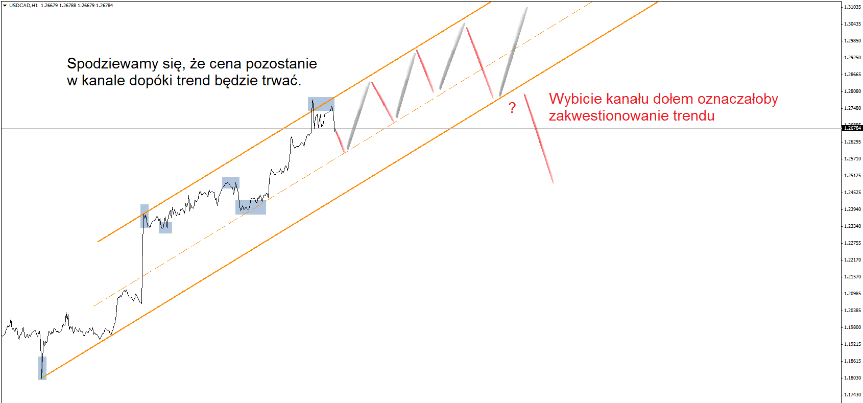 Widać to lepiej, gdy połączy się dołki i szczyty linią ciągłą, tak aby cena nie wystawała w żadnym momencie poza kontur.