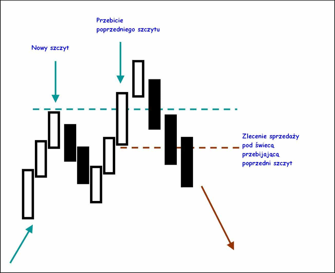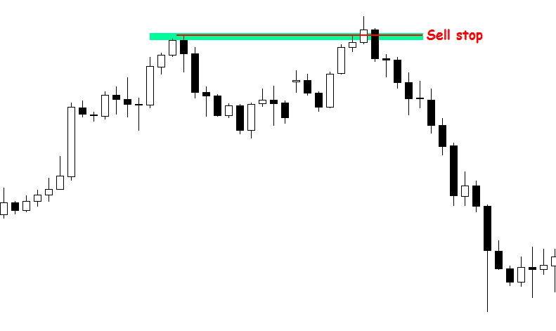 – drugi sposób jest bardziej ryzykowny, choć daje lepszy potencjalny stosunek RR. Polega on na tym, ze ustawiamy zlecenie sell stop w chwili, gdy poziom poprzedniego szczytu zostaje wybity. Najczęściej stosuje się tutaj obserwację na niższych interwałach czasowych. Częstą praktyką jest stosowanie tego rozwiązania, w chwili gdy np. kurs wzrośnie przynajmniej  o 20 pipsów ponad nasz poziom. Wtedy składa się niejako “w ciemno” zlecenie oczekujące licząc na to, że będzie to fałszywka, a nie realne wybicie oporu.