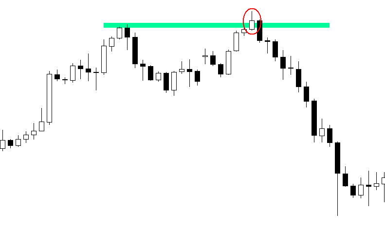 – pierwszy to zagrywanie pod świecę, która fałszywie naruszyła poziom oporu. O tym, że jest to fałszywe naruszenie dowiadujemy się dopiero po zamknięciu świecy, zazwyczaj też na dość wysokich interwałach czasowych: