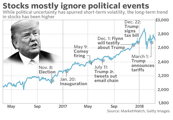 Ze względu na to, że rząd amerykański ustala politykę podatkową i kontroluje wydatki ogólne oraz imigrację, polityka ta może mieć duży wpływ na giełdy papierów wartościowych w USA. Wpływ polityki na giełdę widoczny jest w sezonie wyborczym, gdy kandydaci na prezydenta przedstawiają swoje pomysły polityczne dużym firmom i konsumentom.