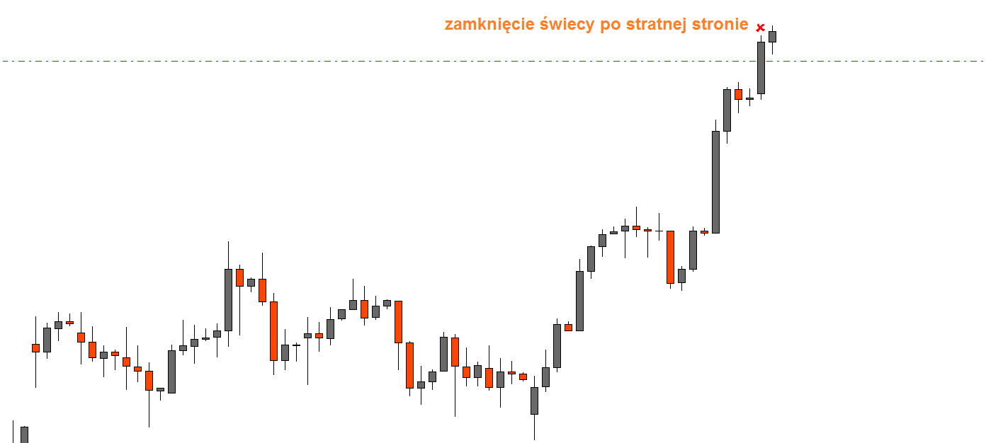 - Stop loss po zamknięciu świecy/sesji jest rzadko używany i polega na tym, że zamykamy transakcję dopiero wtedy, kiedy któraś z kolejnych świec lub cała sesja, zamknie nas po niewłaściwej stronie rynku. Jest to sygnał, że cena nie poszła od razu po naszej myśli i prawdopodobieństwo zakończenia transakcji z sukcesem maleje znacząco. Zaletą takiego rozwiązania będzie to, że często znacząco ograniczymy nasze straty. Wadą z kolei będą wszystkie te sytuacje, kiedy akcja cenowa zdołałaby się jeszcze odwrócić na naszą korzyść mimo chwilowego postoju po ciemnej stronie naszej pozycji. Inna negatywna strona takiego rozwiązania, to nasza psychika, która wielokrotnie utrudni decyzję o zamknięciu pozycji. Również brak prądu, awaria internetu, czy nasza nieobecność przy terminalu handlowym uniemożliwi zamknięcie takiej transakcji manualnie. Dlatego też zalecamy używać równolegle oddalonego nieco automatycznego zlecenia stop-loss, które w razie niemożności manualnej ingerencji w pozycję ochroni nasz kapitał przed niespodziewanym ruchem rynku.
