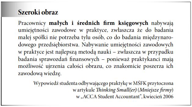 Małe i średnie firmy księgowe ściśle współpracują ze swoimi odpowiednikami na rynku, tzn. małymi i średnimi przedsiębiorstwami (MiŚP). Często we współpracy takiej pełnią funkcję „doradcy finansowego na pół etatu”, ponieważ MiŚP niejednokrotnie nie stać na zatrudnienie dyrektora finansowego. Ma to miejsce zwłaszcza w krajach, w których mniejsze spółki nie mają prawnego obowiązku przeprowadzania pełnego badania sprawozdania (zob. przegląd księgowy). Według danych Stowarzyszenia Dyplomowanych Biegłych Księgowych (jak podano w „ACCA Student Accountant”, kwiecień 2006) około 60% jego członków pracuje w MiŚP lub małych i średnich firmach księgowych. Choć tym ostatnim być może brakuje prestiżu, mogą być one dobrym polem do nauki zawodu, ponieważ umożliwiają studentom rachunkowości uczestnictwo w szerokim zakresie zadań w badaniu sprawozdań finansowych.