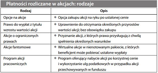 Wśród kierownictwa wyższego szczebla najbardziej popularne są opcje na akcje (forma ta jest rozpowszechniona zwłaszcza w USA). Z płatnościami rozliczanymi w akcjach wiążą się dwie kwestie. Pierwsza to zasadność umożliwiania osobom na wysokim szczeblu czerpania pokaźnych korzyści. Czy może to być bodźcem do manipulacji lub oszustwa? Czy jest to uczciwe? Czy zasłużone? Czy będzie wywoływać zazdrość? Po drugie, niezależnie od zalet tego rozwiązania, powstaje kwestia jak rozliczyć się wobec akcjonariuszy spółki z kosztów takich programów wynagrodzenia. Zob. opcje na akcje, rozliczanie w rachunkowości.