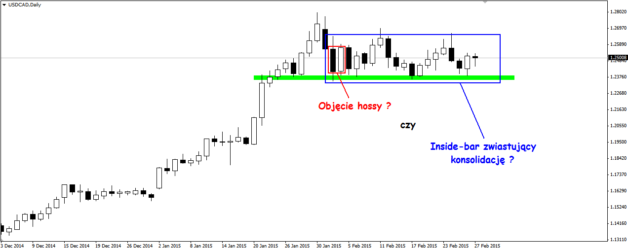 Część osób powie – a jaka to różnica ? Jest ona istotna, gdyż objęcie hossy jest zapowiedzią wzrostów, natomiast inside-bar sygnalizuje możliwą konsolidację i dopiero wybicie z tej formacji wskazuje kierunek, który może się okazać inny niż ten prognozowany przez gracza widzącego objęcie hossy.
