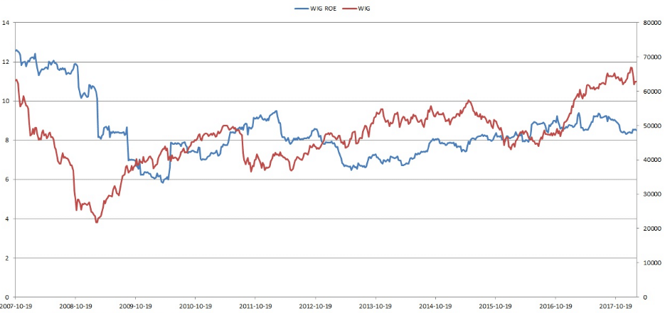 Rentowność kapitału (ROE) nie jest wartością stałą. Poniżej znajduje się wykres pokazujący zmiany ROE dla indeksu WIG w czasie. Jak widać, wskaźik ROE w dużej mierze zależy od fazy cyklu, w którym zlokalizowany jest rynek kapitałowy. Zyski mogą podlegać silnym wahaniom, co znajduje odzwierciedlenie w zwrocie z kapitału własnego. Można oczekiwać, że zmiany ROE w stosunku do spółek będą analogiczne do zmian dla indeksu.