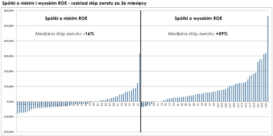 Postarajmy się przynajmniej dotknąć tego tematu. Obliczyłem współczynnik korelacji dla obecnych poziomów ROE (firmy WIG140 – III kwartał 2017 r.) I ich stóp zwrotu (zmiany ich stóp procentowych) w okresie 36 miesięcy. Współczynnik korelacji wynosił tylko 0,35. Można zatem zauważyć, że związek między ROE a stopą zwrotu nie jest liniowy. Rzeczywistość jest bardziej skomplikowana. Są po prostu inne czynniki, które również należy wziąć pod uwagę.