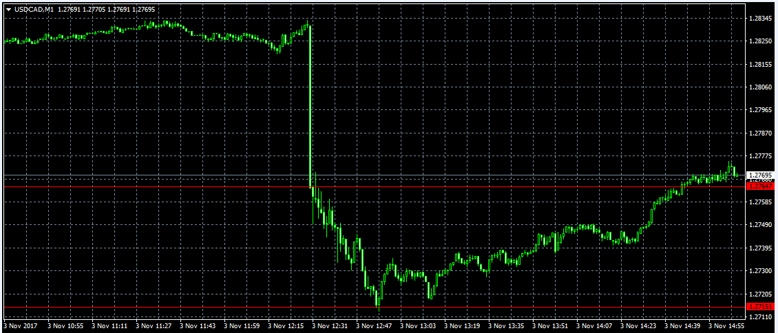USDCAD: Minutę po danych był kwotowany na poziomie 1.2765 (chociaż transakcję testową po danych udało mi się zrealizować nawet po kursie 1.2786) w ciągu paru minut osiągnął minimum na poziomie 1.2715.