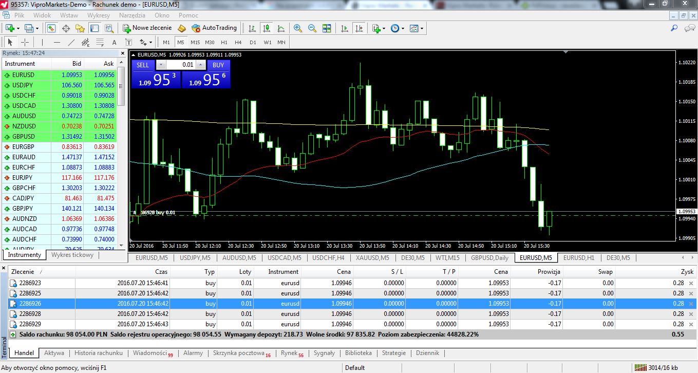 Muszę powiedzieć, że to broker rzetelny, uczciwy i ma najlepsze spready na rynku. Zleciłem 4 wypłaty na różne sumy, w odstępie dwóch miesięcy. Wypłata środków zajmuje max kilka godzin. Jeśli zlecimy wypłatę w nocy prawdopodobnie będziemy czekać do rana. Na platformie brokera otworzyliśmy ponad 450 transakcji w ciągu tych dwóch miesięcy. Na żadnej transakcji nie wystąpił rekwot ani zawiecha platformy. Wszystkie transakcje realizowane w błyskawicznym tempie. Warto dodać, że broker Vipro Markets oferuje najniższe koszta transakcyjne. Jako minus można zaliczyć brak możliwości handlu na akcjach. Jest to broker typu ECN, więc można to zrozumieć.