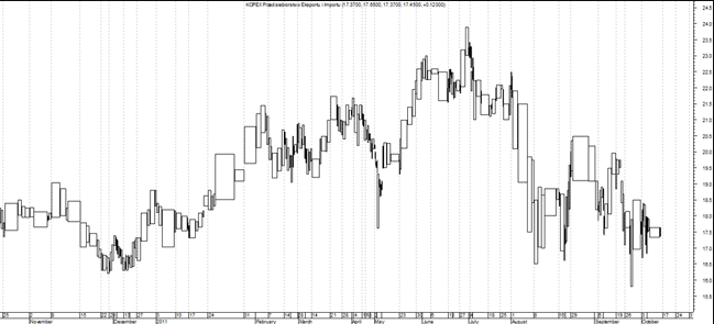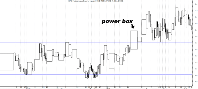 Wspominając o kształtach prostokątów, zwróć uwagę na najważniejszy kształt – power box . Prostokąt siły pokazuje inwestorom sesję, podczas której kurs przełamał ważny poziom. Zazwyczaj skrzynka zasilania ma kształt prostokąta oznaczonego powyżej jako. Zakres cen jest duży, a głośność wzrasta. Przykład skrzynki zasilającej pokazano na wykresie Kopex SA.