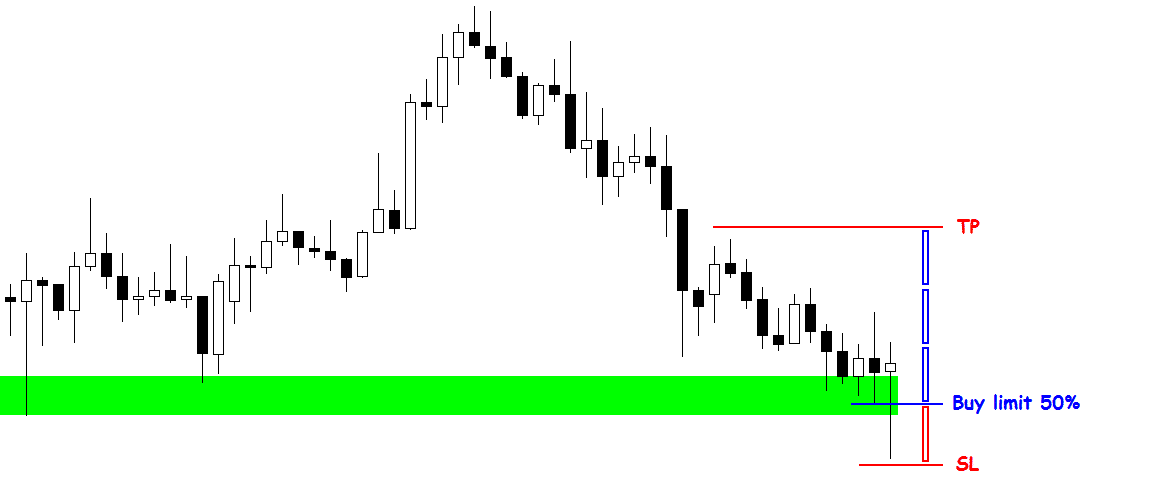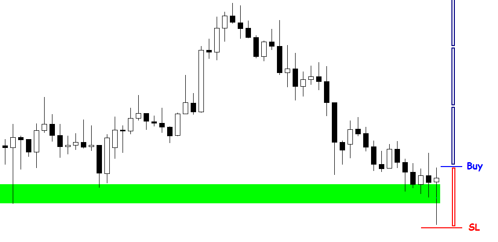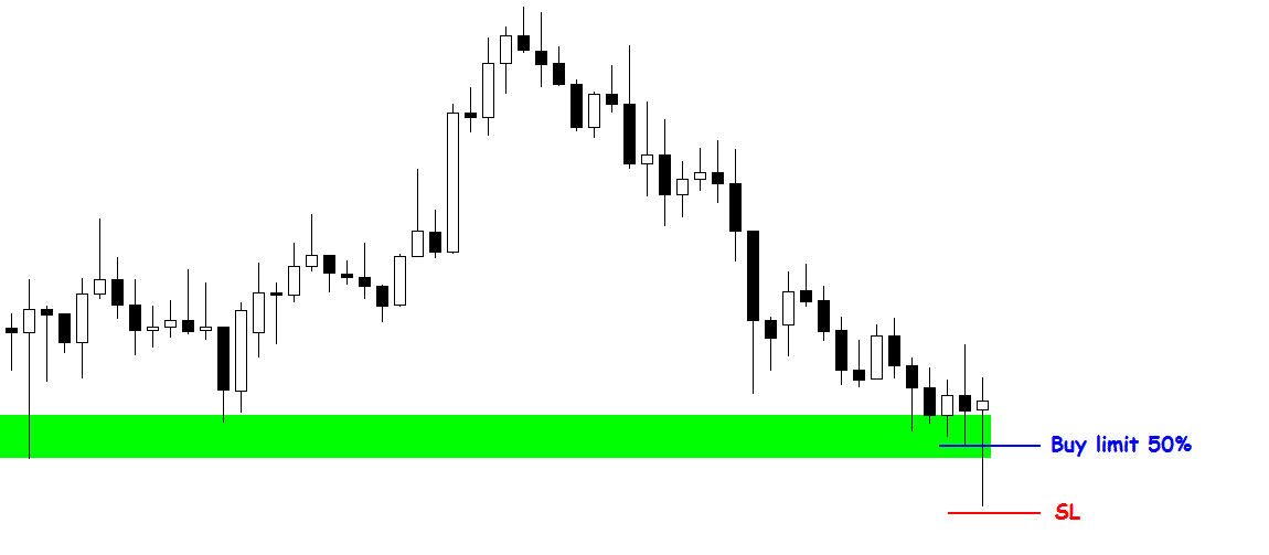 Gracz widząc formację świecową odwrotu, w tym przypadku pin bara w strefie wsparcia – ustawia zlecenie oczekujące kupna w 50% tej świecy. Jest to najczęściej stosowana proporcja z jaką się spotkałem.